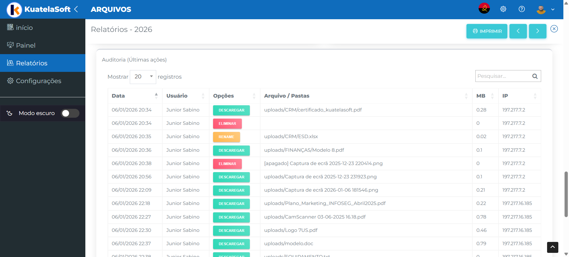 Relatórios completos de acessos, alterações, uploads e histórico documental.